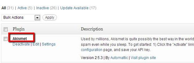 | Description: “The Akismet WordPress Plugin protects your blog from comment and trackback spam. It keeps your site protected from spam even while you sleep.” |