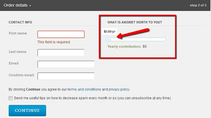 | On the right side under “WHAT IS AKISMET WORTH TO YOU?” shift the slider to the leftmost point until it shows $0.00/yr. |